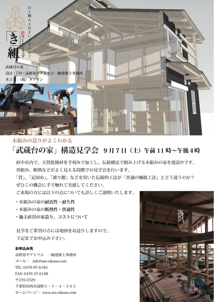 見学会 · 29日 8月 2013 「武蔵台の家」構造見学会 開催 府中市内で建設中の木組みの家、「武蔵台の家」の構造見学会を開催します。 天然乾燥材手刻み、伝統構法の家造りを実際に見て触れて体感してください。 施主直営・分離発注方式についてもご説明します。 見学ご希望の方はメールにてお申込みください。 当日連絡は、080-5099-9160 までお願いします。 tagPlaceholderカテゴリ: 住宅 コメントをお書きください コメント: 0
