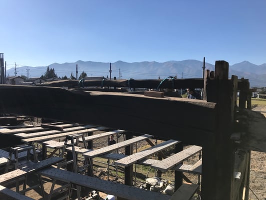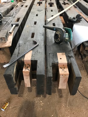 両側に30cm以上差し込まれた牛梁は建っている状態では抜くことは不可能です。門型に組まれたままクレーンで吊りました。