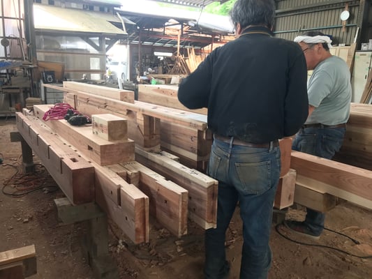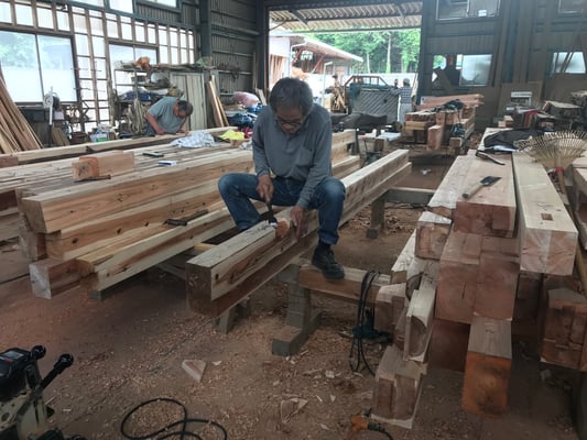 解体後に移送した千葉県の根本建設では、新たに壁を作る部分に貫の穴を彫ったり、腐食、破損しているホゾなどを補うなど、結構な量の墨付け、刻み作業が必要です。
